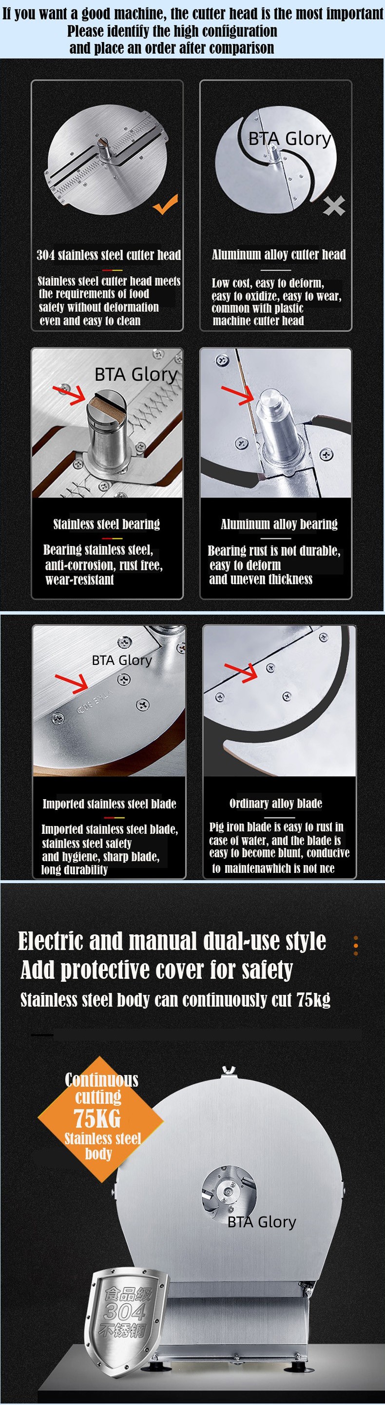 The body, cutter head, blades, and bearings are made of stainless steel material, which is acid resistant, corrosion-resistant, and meets food safety requirements.